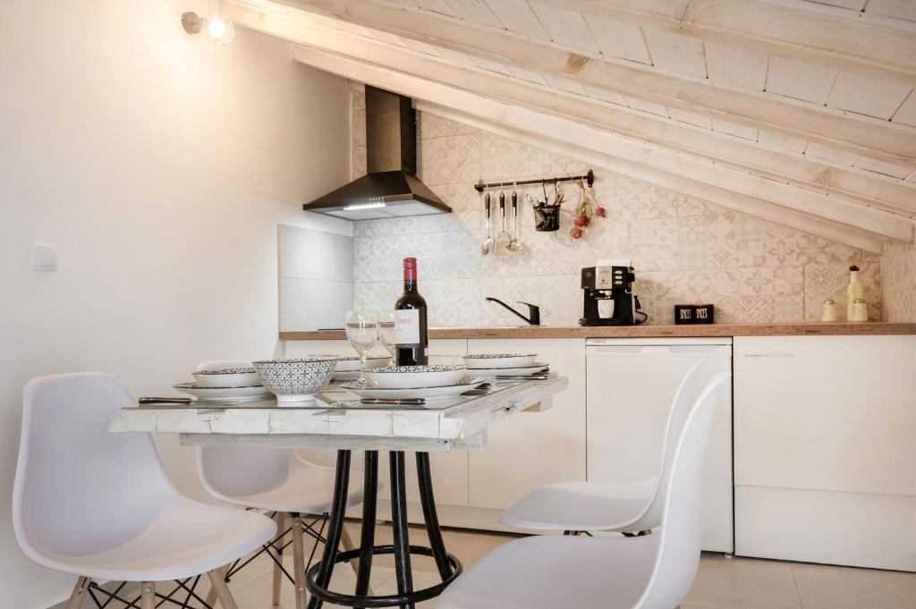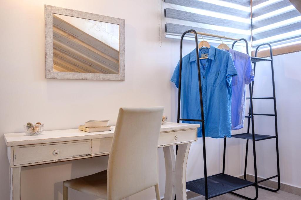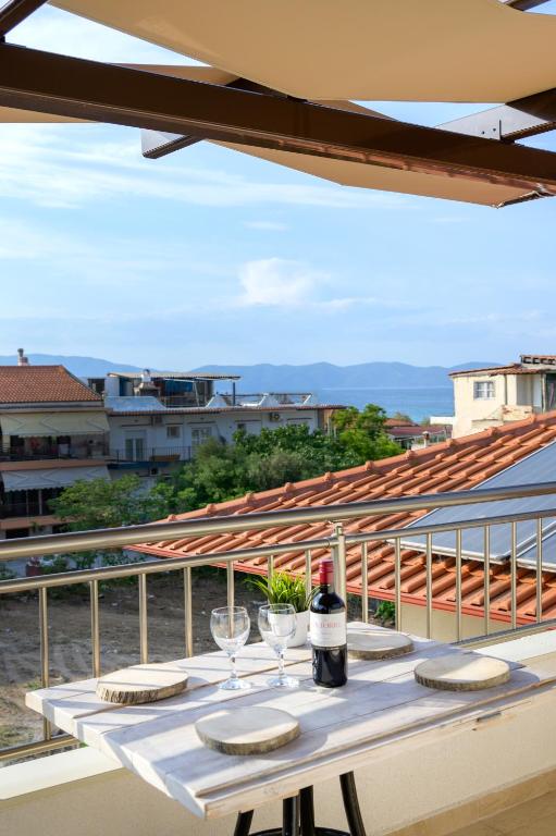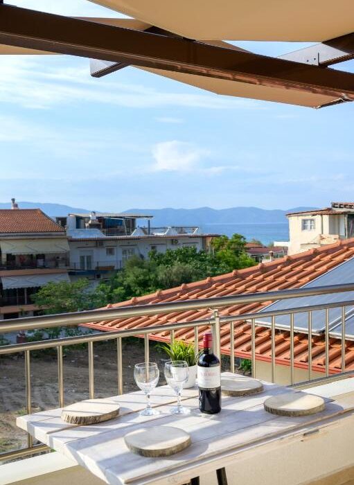 Дуплекс апартман број 1 (1/4) – прв кат, простран дуплекс апартман од 41м² со 2 одвоени спални соби. Има поглед на градина од една тераса (на која се излегува од едната спална) и директен поглед море од друга тераса (на која се излегува од другата спална). Дуплекс апартманот има три одделни простории: 2 одвоени спални соби, од кои во едната има брачен кревет, а во другата 2 споени стандардни единечни кревети, целосно посебно одвоена опремена кујна со сите потребни елементи (голем фрижидер, мал шпорет со рерна, кујнски прибор, електричен бокал за вода и сл.) и простран тоалет со туш кабина. Опремен е со квалитетен мебел. На двете тераси има маси и столови.