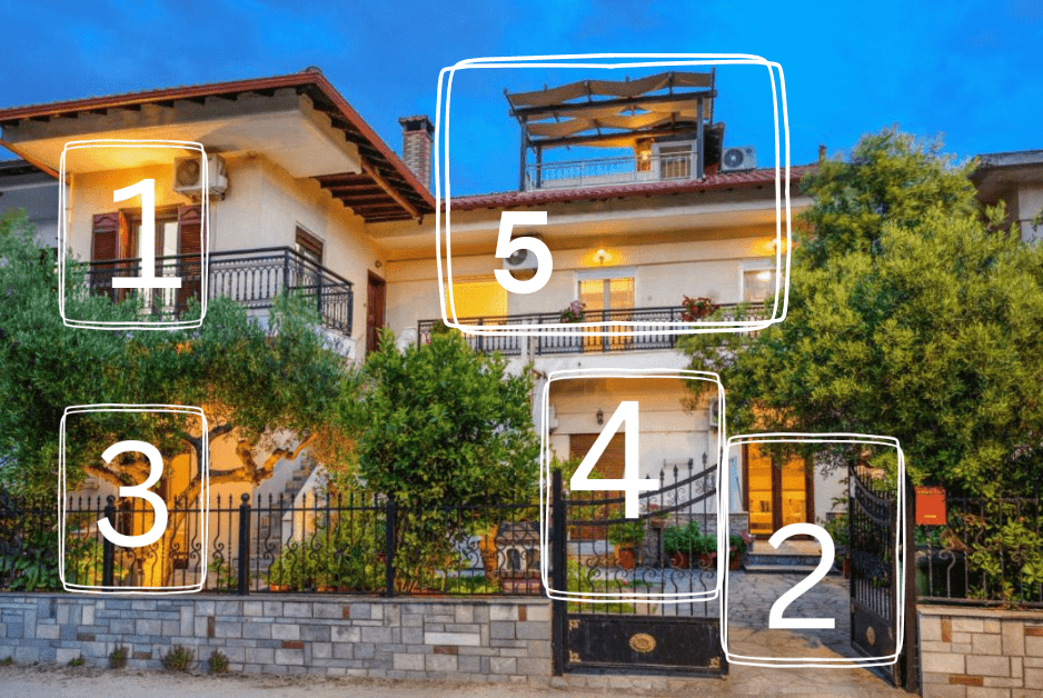 Дуплекс апартман број 5 (1/4 + 1) – втор кат, поткровје, многу простран високо квалитетен дуплекс апартман од 70м², кој воедно е и најголем дуплекс апартман во вилата. Има две одвоени спални соби со стандарден брачен кревет во едната и стандарден брачен кревет во другата спална соба. Располага со простран реновиран тоалет со туш кабина, како и голема дневна соба со софа и целосно опремена екстра реновирана кујна со сите потребни елементи (голем фрижидер, шпорет со рерна, кујнски прибор, електричен бокал за вода, и сите потребни елементи). Опремен е со високо квалитетен мебел. Има тераса со маси и столови и страничен поглед море.