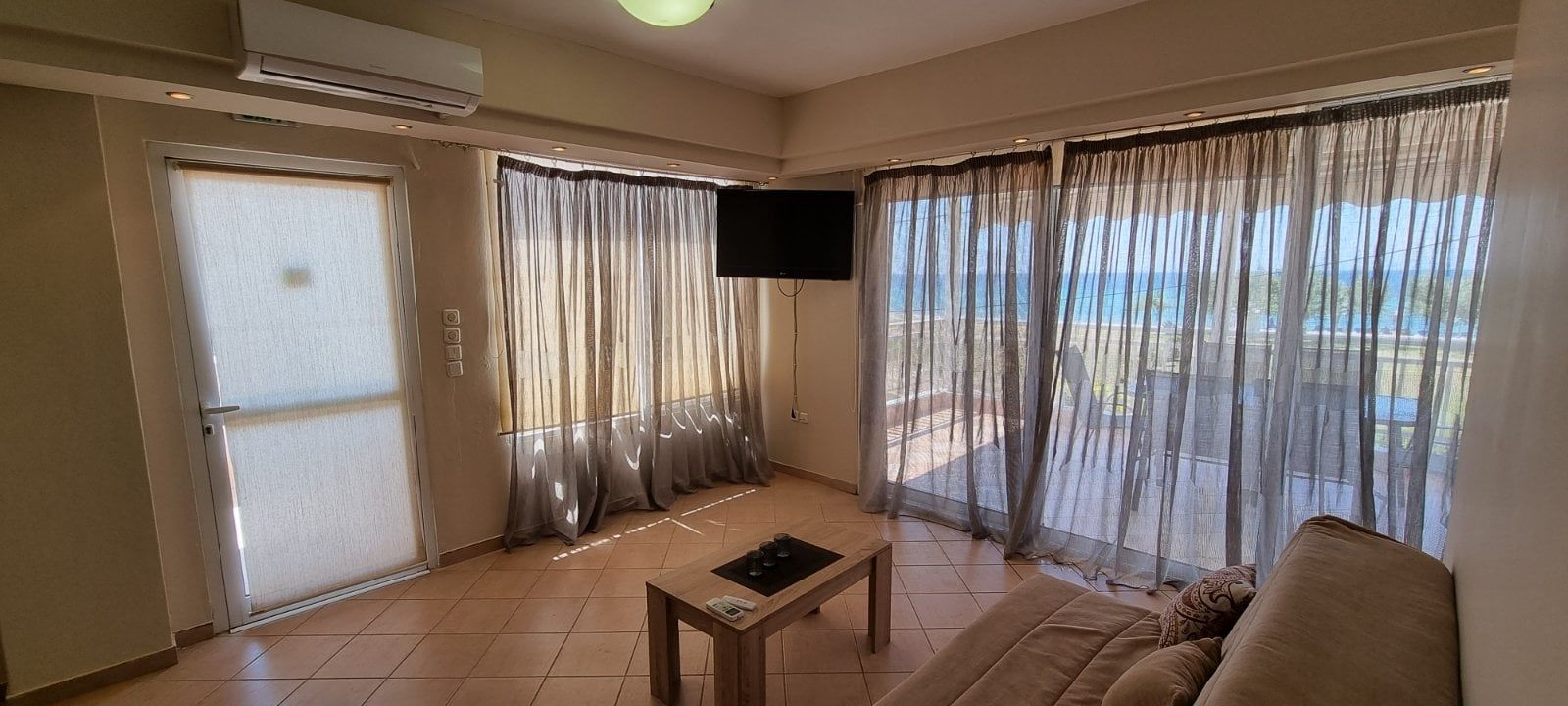 Студио бр. 3 – приземје. Располага со комплетно опремена кујна, тоалет, голема пространа тераса со директен поглед море, клима, ТВ, Wi-Fi, комарници и тенда. Има француски кревет и аголна гарнитура на пуштање.