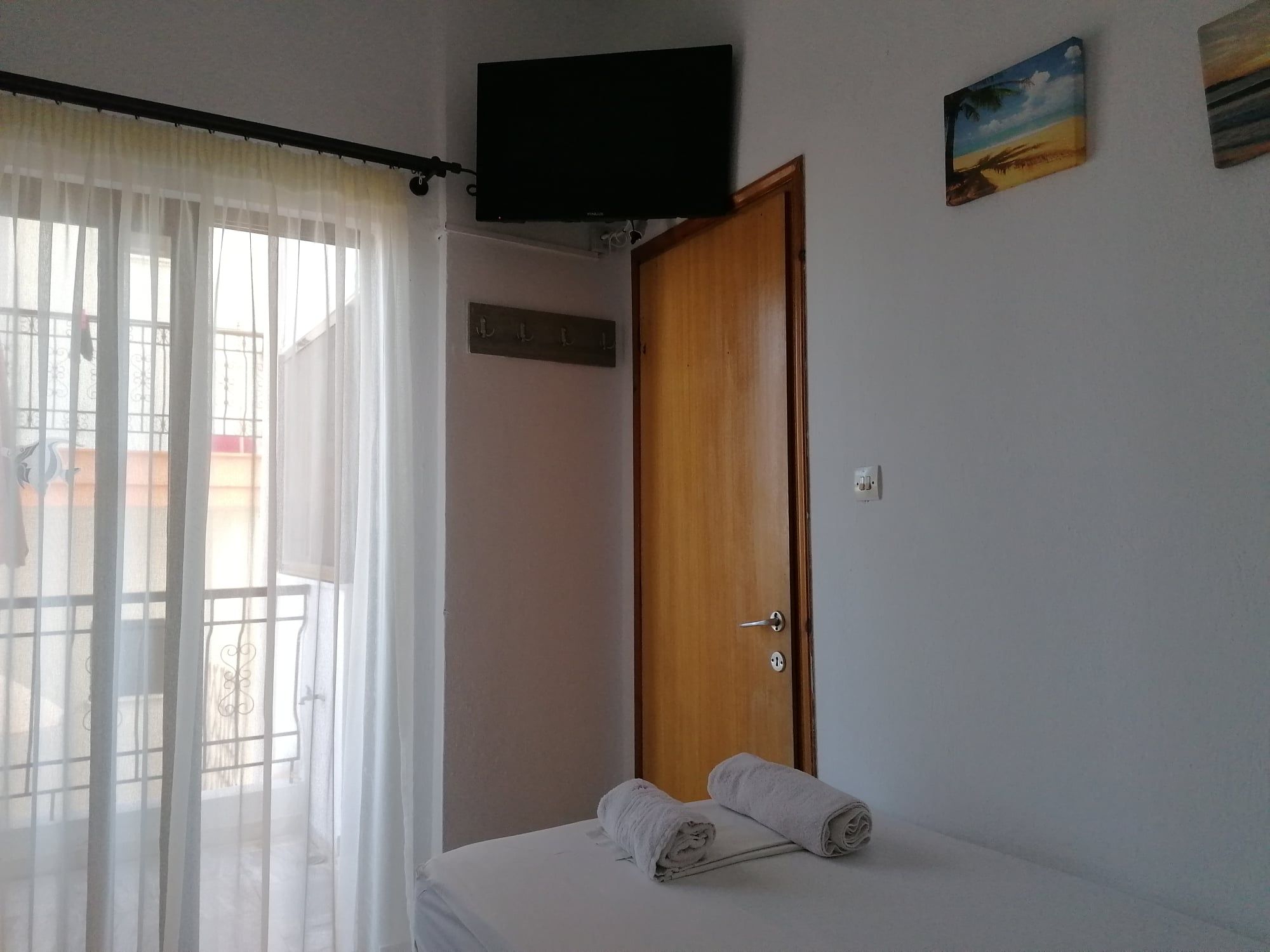 1/5 Дуплекс апартман бр. 16 – втор кат. Дуплекс апартманот има три простории, од кои две се посебно издвоени спални соби со врати и посебна кујна што се наоѓа во средина меѓу двете соби. Во едната спална соба има еден брачен кревет (димензии 195-135 см) и еден единечен кревет (димензии 190-90 см), квалитетен мебел, фен и телевизор. Во втората спална соба има брачен кревет (димензии 192-132 см). Од едната соба и од кујната се излегува на пространа тераса со поглед на улица опремена со пластична маса и столчиња. Во средината меѓу двете спални соби има комплетно опремена кујна во која има голем шпорет со рерна, аспиратор, голем фрижидер со одделна комора и комплет садови за готвење и јадење. Тука се наоѓа и клима уредот. Апартманот има реновиран простран тоалет со туш.