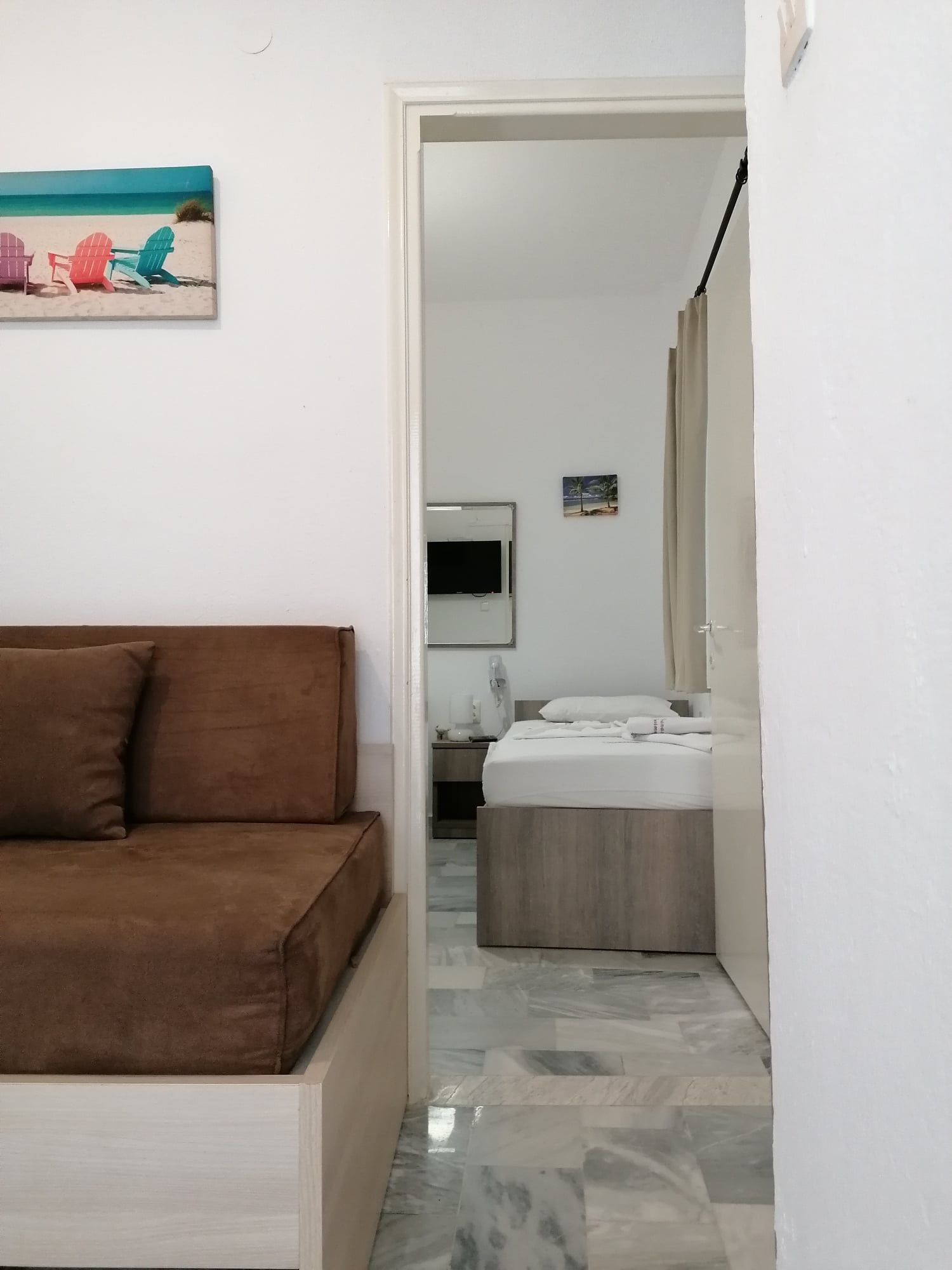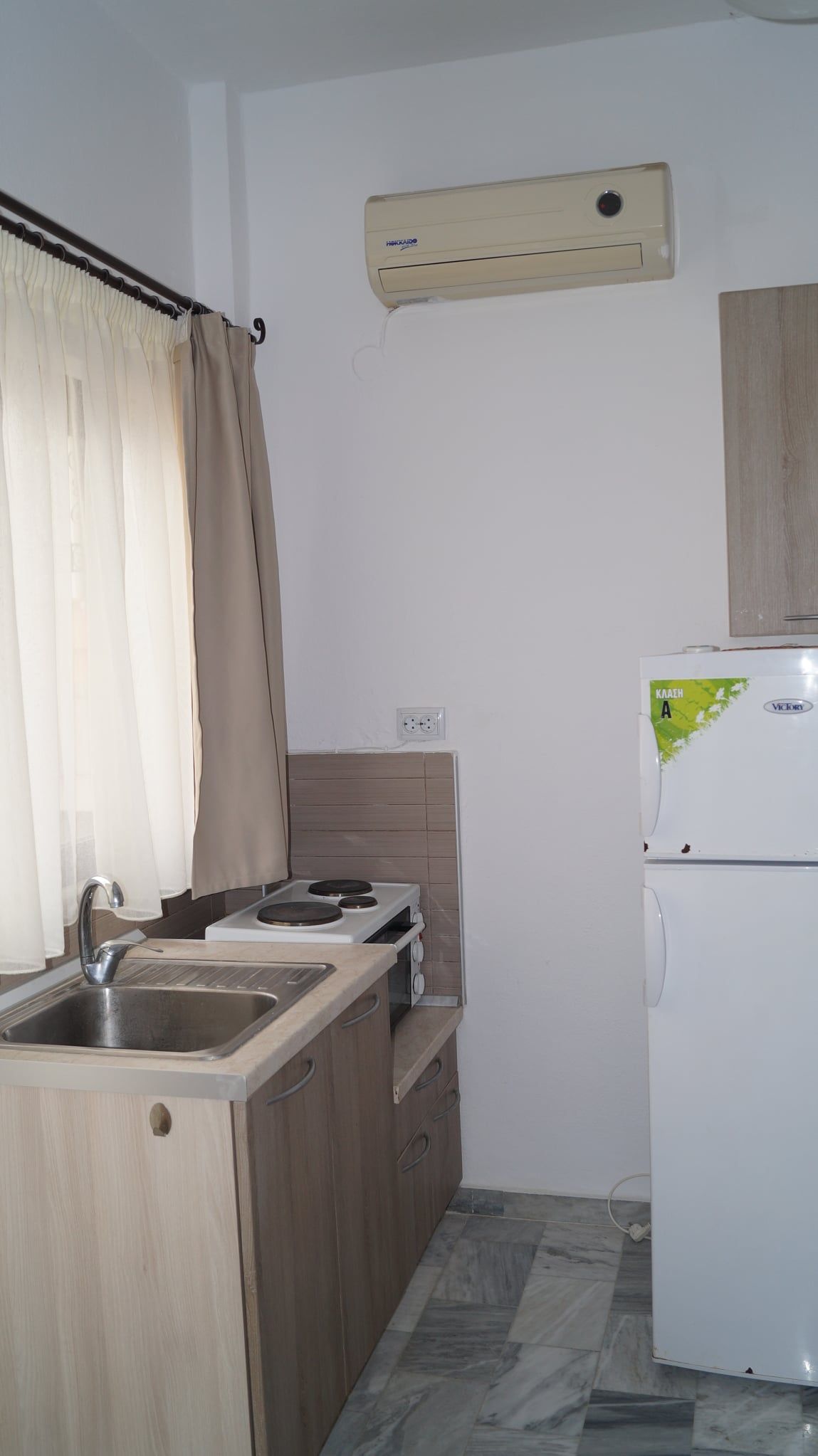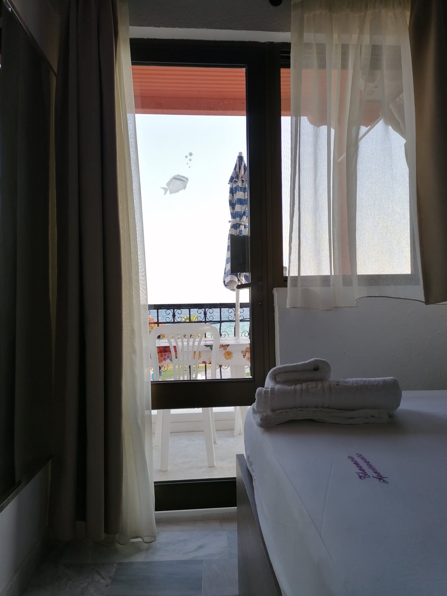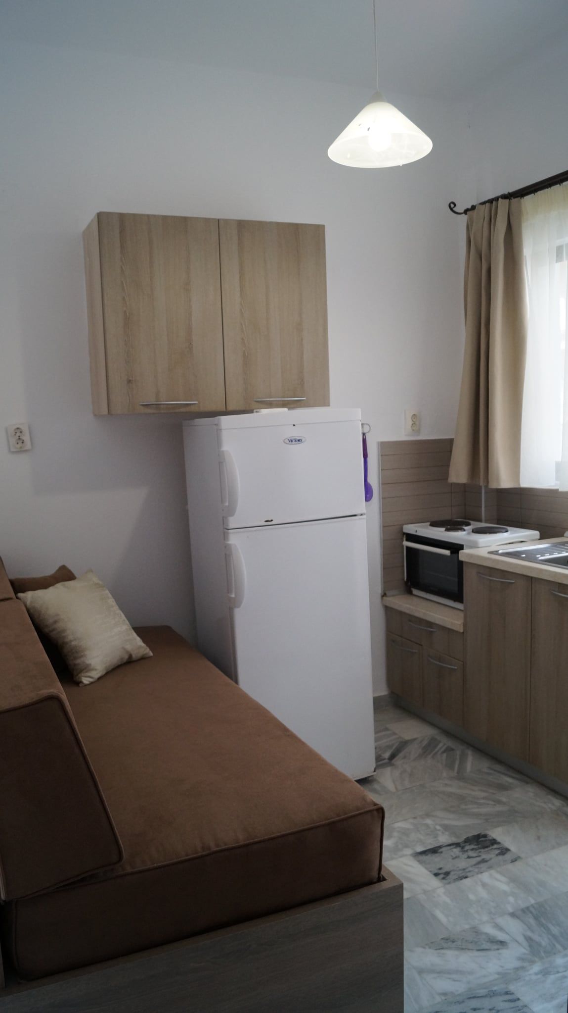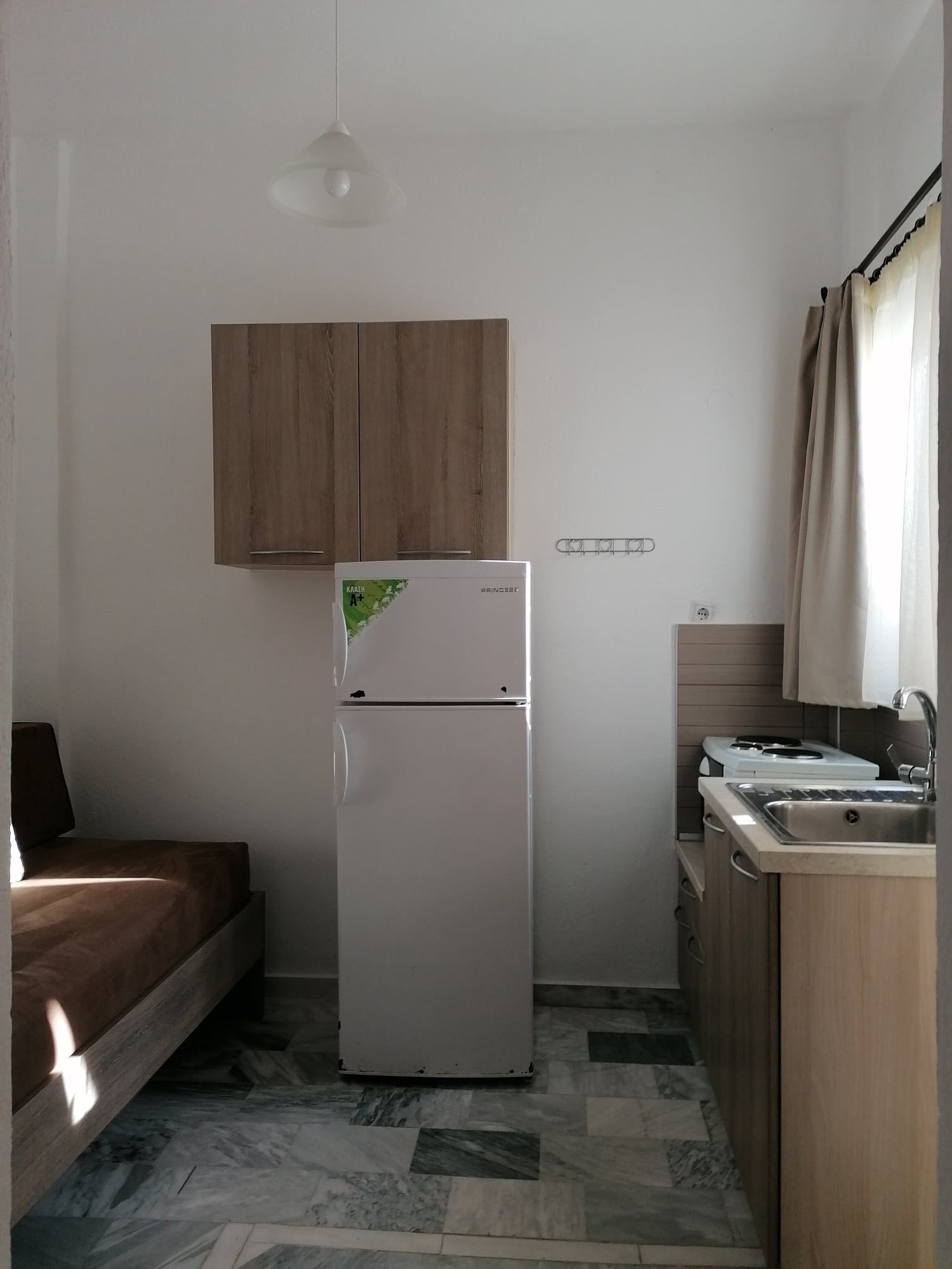 1/3 Студио бр. 10 – втор кат. Студиото има една просторија. На самиот влез има комплетно опремена кујна со мини шпорет со рерна, аспиратор и комплет садови за готвење и јадење. Во овој дел се наоѓа климата. Во продолжение на просторијата има еден брачен и еден единечен кревет, мебел, телевизор, фен и голем фрижидер со одделна комора. Од студиото се излегува на терасата која има директен поглед на море и е опремена со пластична маса и столчиња. Има потесно купатило со туш.