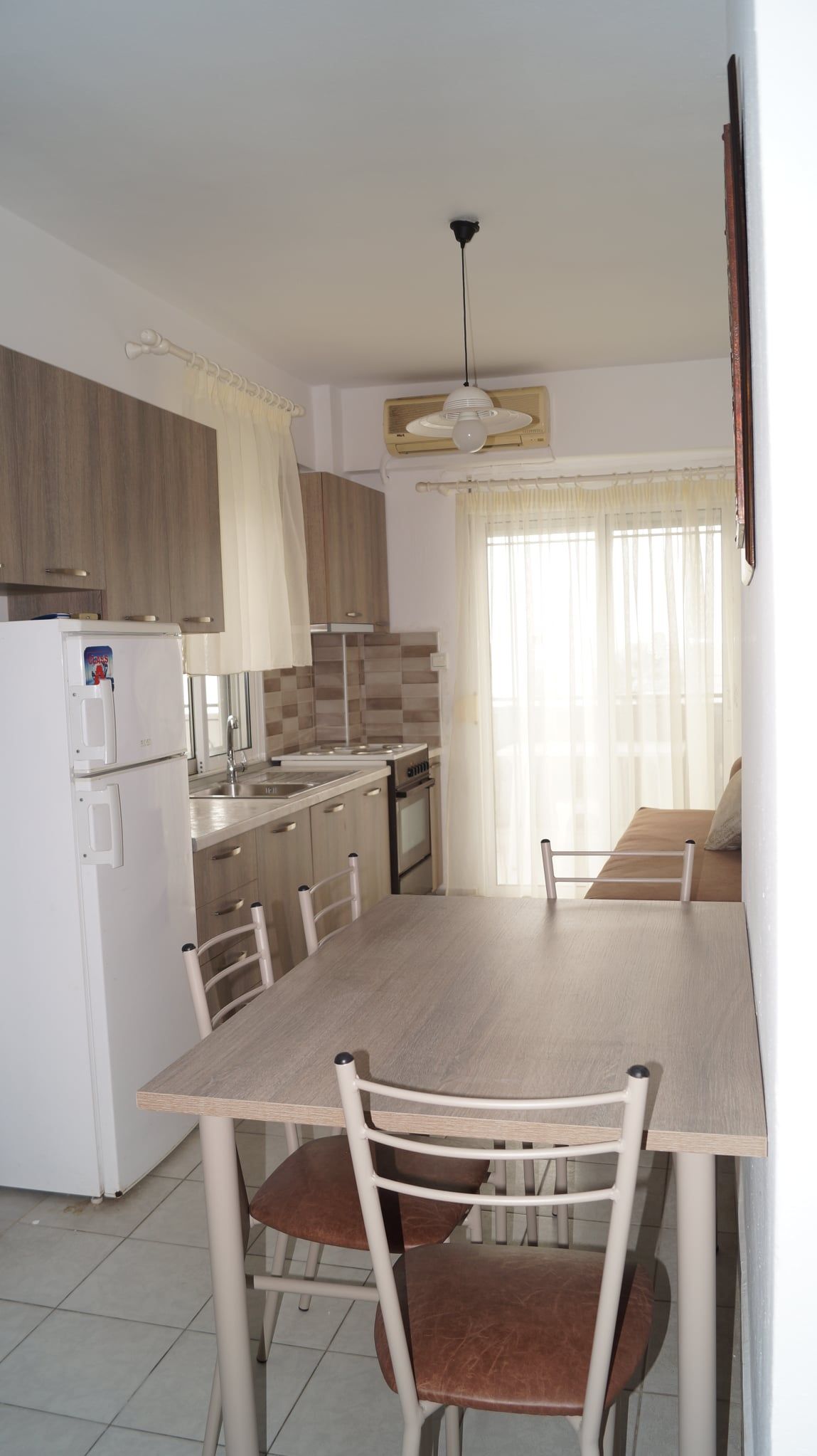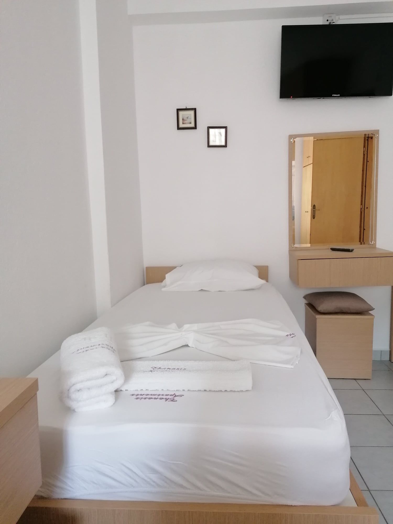 1/6 Дуплекс апартман бр. 24 – прв кат. Дуплекс апартманот има три простории, од кои две се посебно издвоени спални соби со врати и посебна кујна што се наоѓа во средина меѓу двете соби. Во едната спална соба има брачен кревет (димензии 195-135 см) и стандарден единечен кревет (димензии 190-90 см), мебел, фен и телевизор. Собата има прозорец кој има поглед кон улицата. Во втората спална соба има брачен кревет (димензии 192-132 см) и еден единечен кревет (димензии 180-85 см), мебел, фен и телевизор. Од собата се излегува на долга тераса со поглед на улицата, опремена со пластична маса и столчиња. Во средината меѓу двете спални соби има комплетно опремена кујна во која има голем шпорет со рерна, аспиратор, голем фрижидер со одделна комора и комплет садови за готвење и јадење. Тука се наоѓа и клима уредот. Од кујната исто така се излегува на терасата. Апартманот има станадарден тоалет со туш.