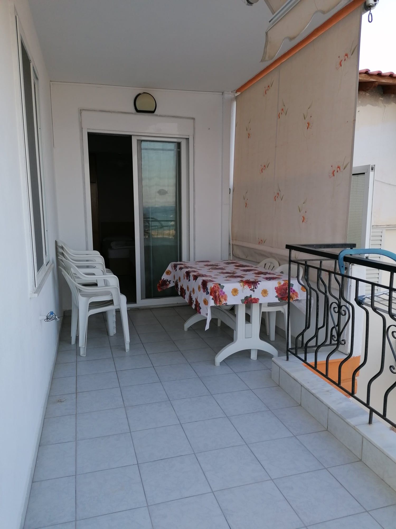 1/5 Дуплекс апартман бр. 9 – втор кат. Дуплекс апартманот има две одделни спални соби меѓу кои се наоѓа купатилото и мал простор меѓу нив во кој се сместени елементите од кујната (мини шпорет со рерна, аспиратор, голем фрижидер со одделна комора, комплет садови за готвење и јадење, како и мала масичка со столчиња). Во едната спална соба има еден брачен кревет и еден стандарден единечен кревет, мебел, фен и телевизор. Собата има прозорец кој гледа кон ходникот на вилата. Во другата соба има еден брачен кревет (димензии 190-140 см), мебел, фен и телевизор и клима. Од собата се излегува на терасата која има директен фронтален поглед на море и е опремена со пластична маса и столчиња. Дуплекс апартманот има купатило со сопствен бојлер.